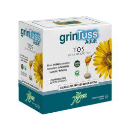 Aboca GrinTuss 20 Comprimidos para chupar actúa en la lucha contra la tos seca, aliviando la irritación de la mucosa y promoviendo la hidratación y la eliminación del moco. Las tabletas Grintuss están compuestas de miel y complejos moleculares (Grindelia, plátano, Helichrysum), ejerciendo una acción protectora y calmante en la vía aérea superior. La miel presente en la fórmula proporciona un sabor agradable a la tableta. Este dispositivo médico ofrece: