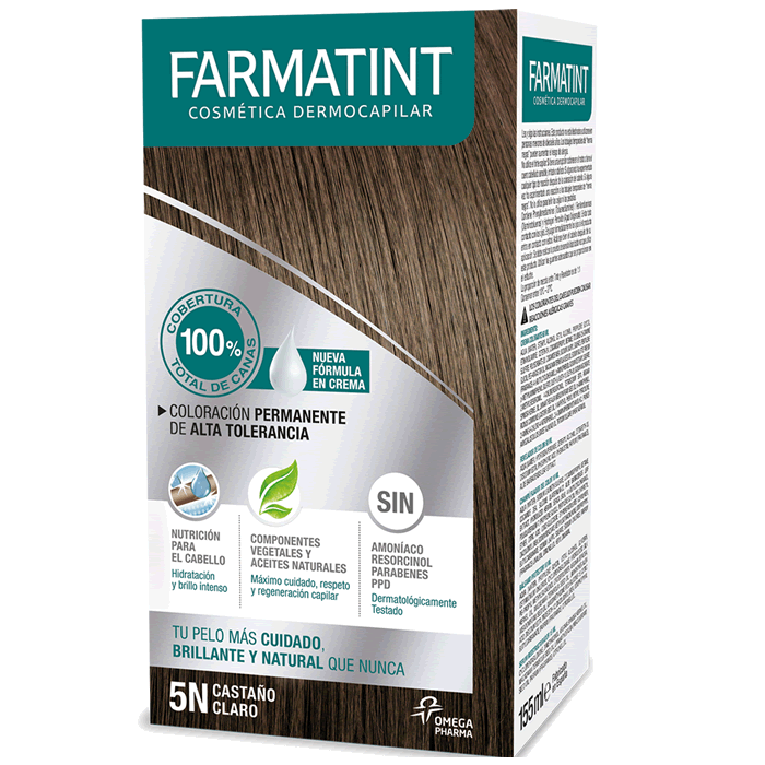 El Farmatint Nueva Fórmula Tinte Natural 5N Castaño Claro ofrece una cobertura total de canas gracias a su innovadora fórmula en crema. Este tinte se caracteriza por ser **sin amoníaco**, **sin resorcinol**, **sin parabenes** y **sin PPD**, asegurando un cuidado óptimo para el cabello. Además, proporciona hidratación y un brillo intenso, garantizando el máximo respeto y regeneración capilar.