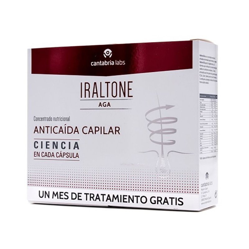 Iraltone AGA es un concentrado nutricional anticaída con gran actividad, actuando a diferentes niveles. Entre sus componentes destaca el aminoácido L-cistina, que es fundamental para la formación de la queratina del cabello. Además, contiene potentes antioxidantes, como la Vitamina C y E, que ayudan a proteger las células del bulbo piloso frente al daño oxidativo. También incluye vitaminas y oligoelementos que contribuyen al mantenimiento del cabello en condiciones normales, tales como las Vitaminas B1, B3, B5, B6, B8, B12, Zinc, Cobre y Selenio. Asimismo, su formulación incorpora aceite de semilla de calabaza, rico en omega 6, omega 9 y fitoesteroles.