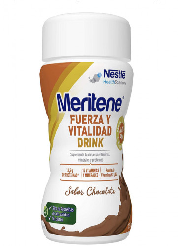 Meritene Drink Chocolate es un suplemento nutricional formulado con vitaminas y minerales que ayudan a disminuir el cansancio y la fatiga. Sus proteínas contribuyen al desarrollo y mantenimiento de los músculos y huesos. Está indicado para ayudar a completar la dieta en el día a día, cuando exista un desgaste físico fuerte o una alimentación insuficiente o desequilibrada, en la que la falta de algunos nutrientes clave puede hacernos sentir más cansados o con menos energía física o mental. Beneficios: