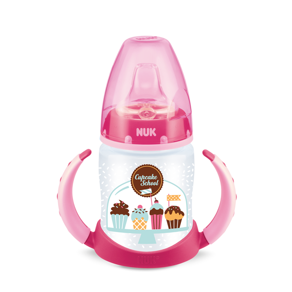 El Nuk Biberón Entrena Cupcakes 150 ml está diseñado para ayudar a tu bebé a aprender a beber agua. Este biberón cuenta con asas ergonómicas que facilitan su uso, permitiendo que el bebé comience a beber a demanda.