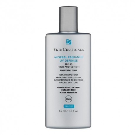 Mineral Radiance UV Defense SPF 50 de Skinceuticals es un fluido con color que proporciona un factor de protección solar de amplio espectro UVA/UVB y SPF 50. Está formulado con extracto de Artemia salina para mejorar las defensas naturales de la piel frente a la radiación UV y el estrés celular generado por el calor. Su textura de fácil aplicación iguala el tono facial y aporta luminosidad. Es recomendable para todo tipo de piel. Utiliza tecnologías clave, destacando un 25% de Dióxido de Titanio, Artemia salina, esferas de color translúcidas y tecnologías de agitación para una eficacia óptima en la aplicación uniforme de los principios activos. Los principales beneficios son que aporta una protección UVA/UVB de amplio espectro, es resistente al agua y al sudor hasta 40 minutos, las esferas de color translúcidas igualan el tono facial y ofrecen luminosidad de forma inmediata, y la Artemia salina aumenta la resistencia de la piel a la radiación UV y al estrés celular producido por el calor.