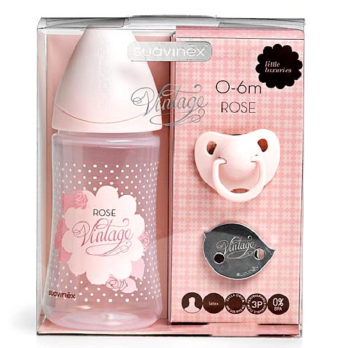 El Suavinex biberón ba 3 posiciones está compuesto por un biberón de boca ancha con tetina que se adapta al ritmo de succión o tipo de alimento, un chupete Evolution y un broche joya Jewel para sujetar el chupete.